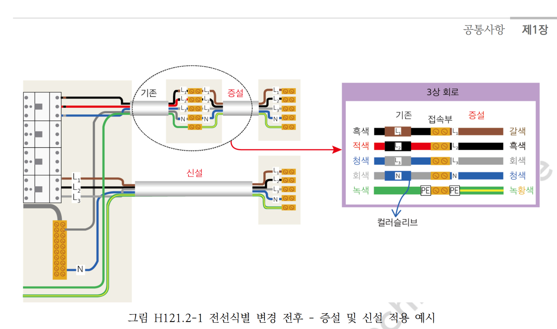 2. KEC 핸드북 p.57에 따라 나도체나 단심 케이블과 같이 색상 등으로 도체길이 전체에 식별을 위한 표시를 할 수 없는 경우 종단 및 연결지점의 단말작업시 전선 종단부에 반 영구적으로 유지될 수 있는 튜브 등이 수단을 이용해서 규정된 식별방법에 따라 식별을 수행해야 합니다. 따라서, 붙임의 사진대로 하였다면 KEC의 전선 식별규정을 위반한 것은 아닙니다. 다만, 질의내용대로 귀하의 수요처에서 요구하는 전선 식별방법도 KEC를 위반한 것은 아니므로 적절히 협의하여 처리하시기 바랍니다. 끝.