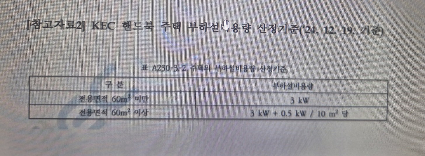 2. KEC 핸드북 (2024년 발행) p.1027의 표 A230-3-2 은 주택의 부하설비용량 산정기준이며, 공동주택을 포함하는 것으로 사료됩니다. 다만, 문의하신 내용과 관련하여 현재 산업통상자원부에서 행정예고 절차 중에 있는 사항(산업통상자원부 행정예고 공고 제2025-147호)이므로 참고하시기 바랍니다. (질의 1).
