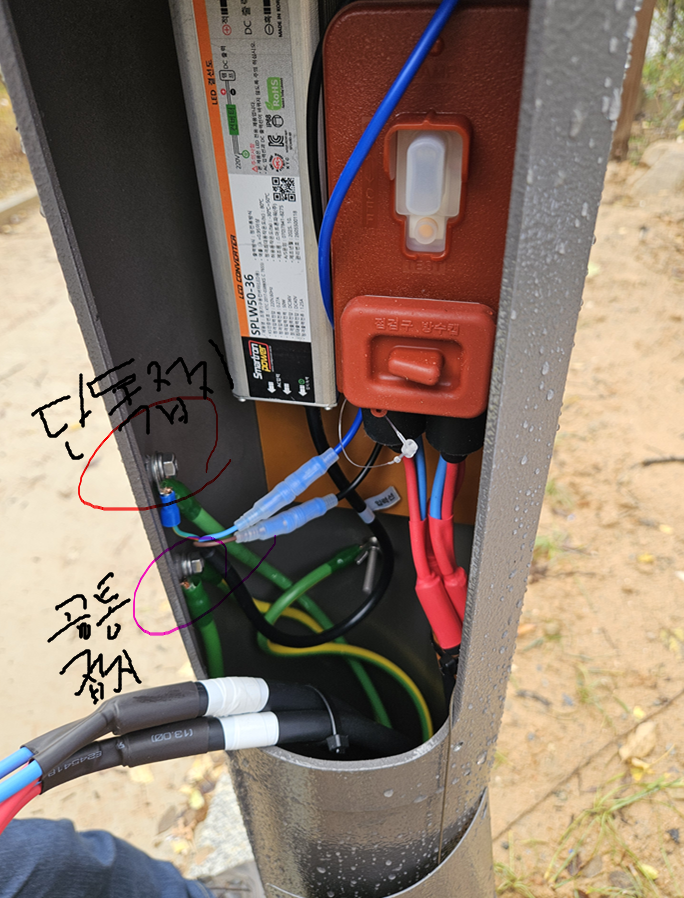 위 사진은 공원등 등주 내부에 단독접지와 공통접지를 병행하여 시공한 사진인데