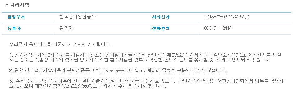 4) 2018년 08월 03일 한국전기안전공사의 위의 내용을 문의 한바 아래와 같이 회신하여 기술적 지도와 판단을 기다리고 있습니다.