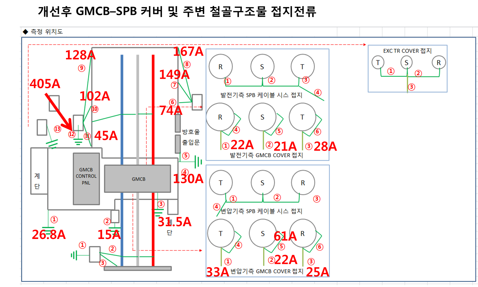 발전기하부 SPB - GMCB - 변압기 주변(철골구조물, SPB보호 커버, 울타리 등)의 과도한 접지전류가 발생하고 있습니다.