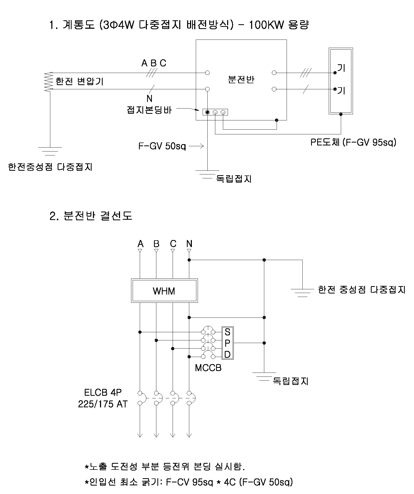 2) 한전계통 3Φ4W 다중접지 배전방식에서 인입을 받아 상기 계통도 및 분전반 결선도로 시공을 하려고 하는데 판단기준 제22조2항 및 한국설비규정(KEC)에 적합한지 조언을 구하고자합니다.