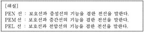 2. KS C IEC 60364에 의한 저압전기설비의 시설을 다룬 내선규정 5110-10에서 “충전부(Live part)란 중성선을 포함하여 정상동작 시에 활성화되는 전선 또는 도전성부위. 규정 상 PEN 선이나 PEM 선 또는 PEL 선은 포함하지 않는다. 【비고】이 개념은 감전의 위험을 반드시 의미하는 것은 아니다.”라고 명시하고 있으며 이때의 PEN 선, PEM 선, PEL 선의 개념은 아래와 같습니다.