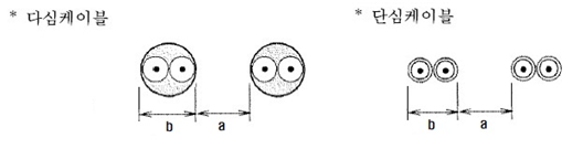 3. 아울러 본 표는 회로별로 적용하는 계수이며 【비고 2】의 “인접 케이블간의 수평간격이 그 외경의 2배를 초과할 경우, 보정계수를 적용할 필요는 없다.”는 IEC 원본이 “케이블 전체 바깥지름의 2배”로 표현하고 있는 바, 아래 그림의 수평간격 a는 전체 바깥지름 b의 2배를 초과할 경우로 적용함이 타당할 것으로 사료됩니다(질의 2). 끝.