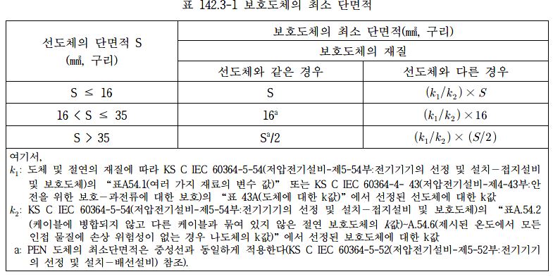 KEC 142.3 중 아래 표에 보면 "선도체와 다른 경우"가 있습니다.