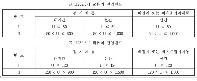 4. 아울러 KS C IEC 60449의 전압밴드 규정은 아래와 같으며(KEC 핸드북 p.275-276 참조), KEC 232.3.7의 1에 명시한 조건 외에는 전압밴드 Ⅰ과 전압밴드 Ⅱ 회로는 동일한 배선설비에 수납하지 않아야 합니다(질의 3). 끝.
