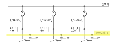 예] 3상 전동기 X 3대 구성, TN-S계통 시 케이블 사양 : 3C 케이블로 전원공급 후 가장 큰 선도체 단면적을 기준으로 MAIN PE선을 선정한 후 각 모터(3대)별 선도체 단면적 기준 SUB PE선 분기 (아래 그림 참조)