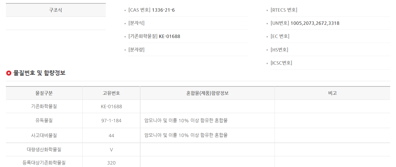 그 기준은 국립환경과학원 화학물질정보 시스템에서 9% 암모니아수의 MSDS 중 CAS No.를 기입하면 아래와 같은 정