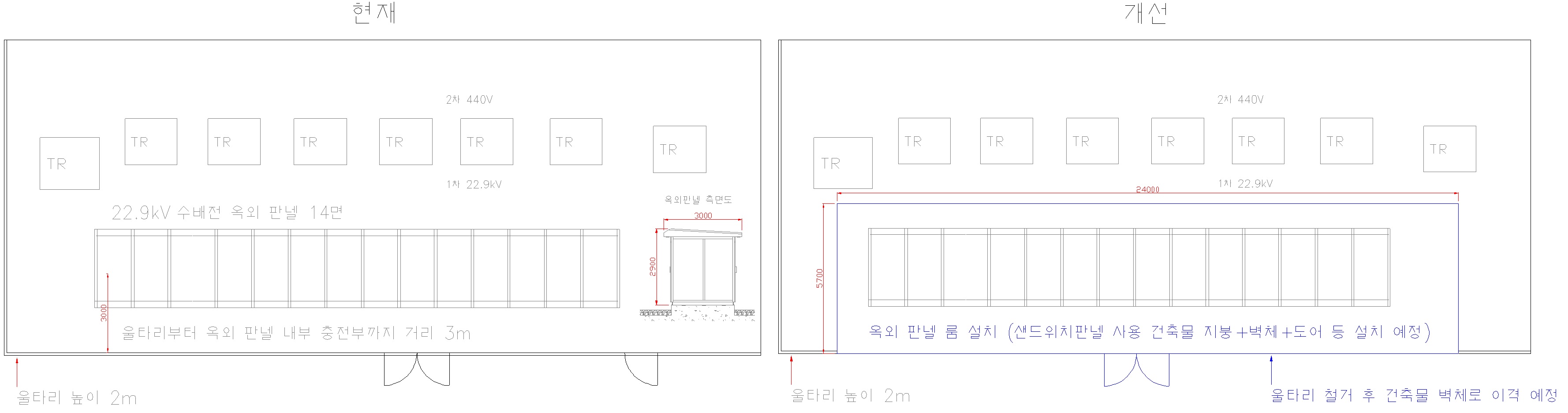 옥외 특고압 수배전 판넬의 부식과 노후화 예방을 위해 아래 도표(개선)와 같이 룸 건축물을 지어 판넬을 보호하려고 합니다.