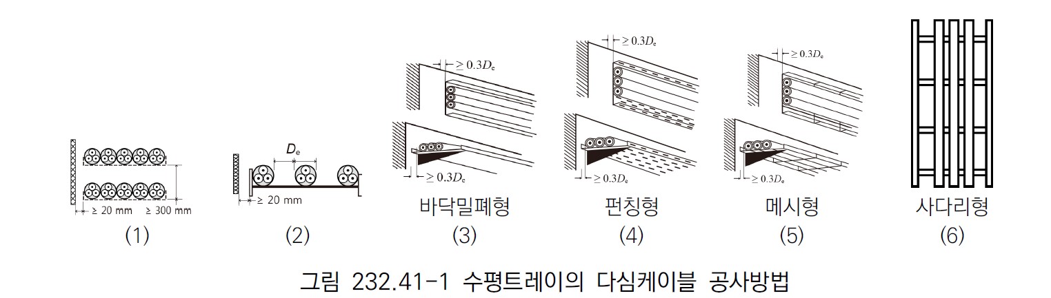 232.40 케이블트레이시스템" 232.41.1 시설조건 6.수평트레이 다심케이블을 포설 시 다음에 적합하여야 한다. 나. 벽면과 간격은 20[㎜]이상 이격하여 설치하여야 한다. |