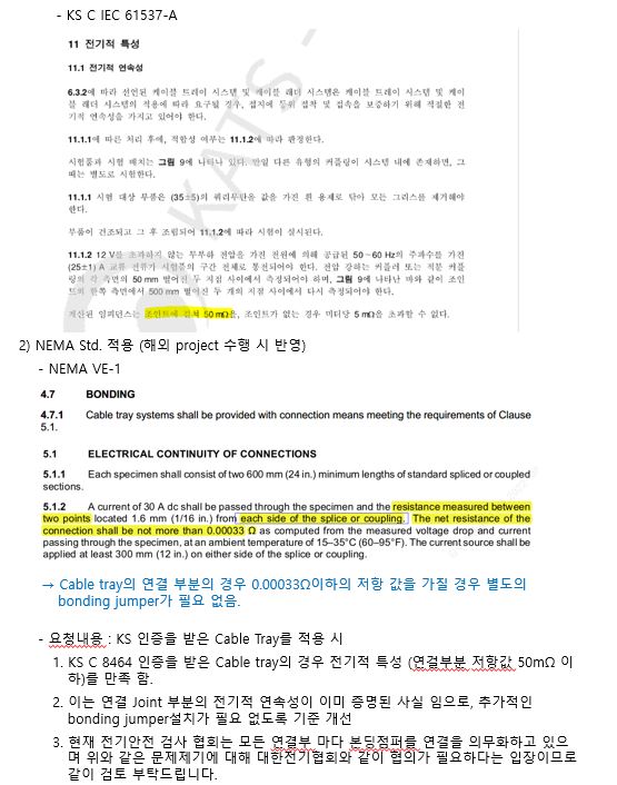 KS C 8464, IEC61537-A에 의거하여 KS 인증을 받은 일반 트레이 연결부는 전기적 연속성을 확보한 것으로 봐야함.
