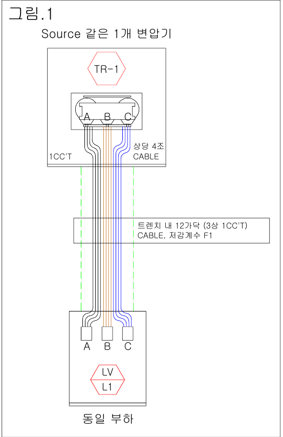 질의 했던 내용은 그림1의 개념으로 한개 변압기 3상 1cc't(회로) A, B, C상 각각의 단심케이블 240sq x 4조가 트렌치 포설구간을 통과할때의 저감 계수 F1에 대한 문의 내용 이었으며, 답변 내용은 집합저감계수 n=12로 적용해서 12/3(상)=4cc't(회로) 적용해야 한다는 내용입니다.