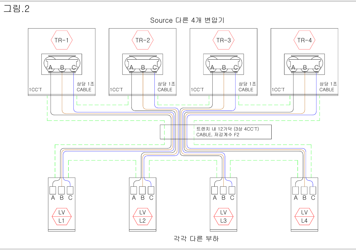 이 개념이라면 그림 2와 같이 각각 다른 source의 4개 변압기 각상 A, B, C 3상 1cc't(회로) 240sq x 1조 4회선 선로가 트렌치에 포설되는 경우와 같다고 할수 있는데 그림 2의 포설은 source가 다른 별개의 전원 4회선 포설로 저감계수 F2는 그림1의 저감계수 F1과 같지 않다고 볼수있습니다. 왜냐하면 그림1은 동일 source이고 각상에서 4조 케이블로 포설되므로 4회선이 아닌 1회선으로 적용해야한다고 사료되나, 답변 내용은 4개의 별도 source 변압기나 1개의 변압기나 source에 상관없이 케이블전체 조수가 12조면 4회로로 적용해야 하는 것으로 이해되어 불합리한 부분이 있습니다. 결론적으로 그림 1과 그림2와 같은 포설시 트렌치내 적용되는 저감계수가 동일하게 적용되는지 보완질의를 드리오니 확인하신후 답변을 부탁드립니다. 감사합니다.